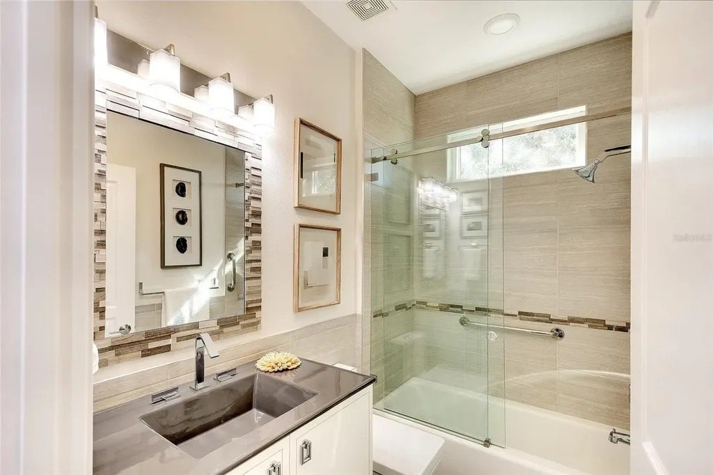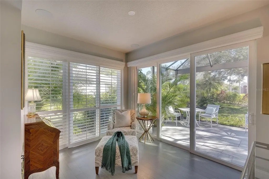Welcome to Your Dream Home in Lakewood Ranch! Discover the perfect blend of luxury, comfort, and convenience in this stunning residence, located in the attendant guard gated community of Edgewater Village. This spacious 3 bedroom, 2 bath home with an impressive 1,803 square feet is situated on a large .22-acre lot, this home offers ample space for relaxation and entertainment. Enjoy the newly added screened-in lanai, completed in 2024, featuring an infinity screen that seamlessly blends indoor and outdoor living with beautiful mature landscaping enhanced with recently added lush tropical plantings. Step inside to find updated engineered hardwood flooring that runs through ALL main areas and bedrooms, coupled with beautiful plantation shutters that add a touch of elegance. The heart of this home is a chef's delight with solid wood custom cabinets featuring soft-close dovetail construction, pull out shelves, custom storage, pot & pan drawers, stylish quartz countertops, under-cabinet lighting, dishwasher and microwave in 2025 and a convenient wine refrigerator - perfect for entertaining! Feel safe and secure with HURRICANE IMPACT WINDOWS and doors throughout, along with a hurricane impact garage door, ensuring peace of mind during storm season. Enjoy the ambiance the stylish electric fireplace adds to the living room. Stay cool with a newer HVAC system installed in 2022 and revel in the luxury of a tankless water heater for endless hot water. The Cove is a MAINTENANCE FREE enclave with a NEIGHBORHOOD POOL & SPA just steps away allowing you to enjoy frequent social events & a resort-style lifestyle without the hassle of upkeep. Nestled in a flood zone X area, good news - NO FLOOD insurance is required! Edgewater Village is a truly Walkable neighborhood with just a short stroll to LWR Mainstreet and across the street from The Pointe shopping center, featuring popular dining destinations like Owens Fish Camp and Bar Italia. The community is beautifully built around the serene 160-acre Lake Uihlein, offering picturesque views and outdoor activities just steps from your front door. $3,111 CDD Fee INCLUDED in tax amount of $8,089 Don't miss your chance to experience hassle-free living in a perfect location. Schedule your private tour today and make this stunning property your forever home!